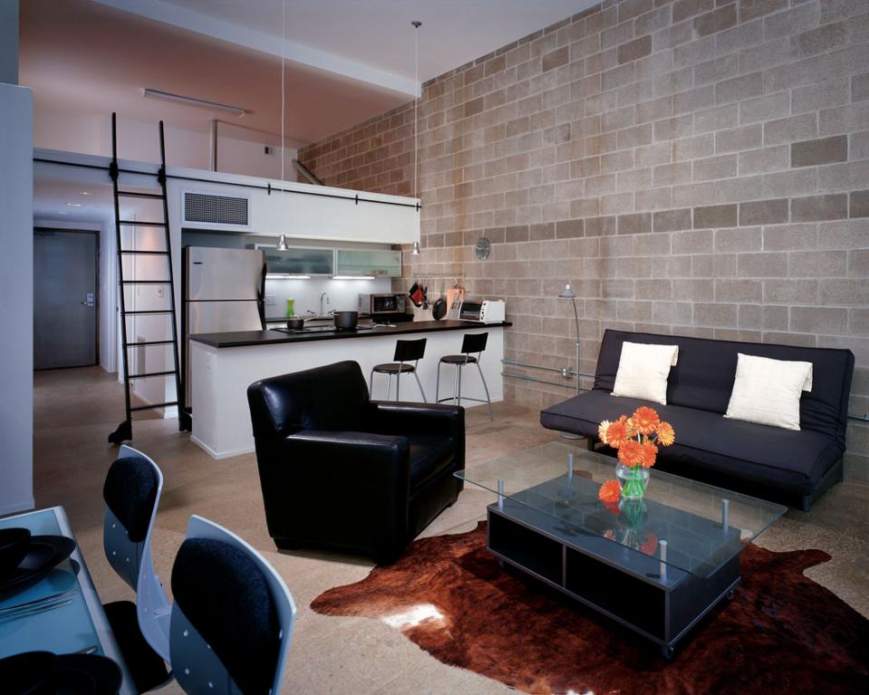 Option B is to loft the bed above the kitchen with a rolling ladder that can go up to the bed or access a bookshelf on the other side that also acts as a railing (bookshelf and rolling ladder budget permitting once again) This frees up a lot more space on the main floor and just looks cooler. One of us has lived in a few apartments like this now and loved them… although she does admit to sometimes yearning for “a real bed” Another downfall of this one is there is no closet in the apartment, but we may be able to rearrange the kitchen to get a closet and kitchen under that loft.