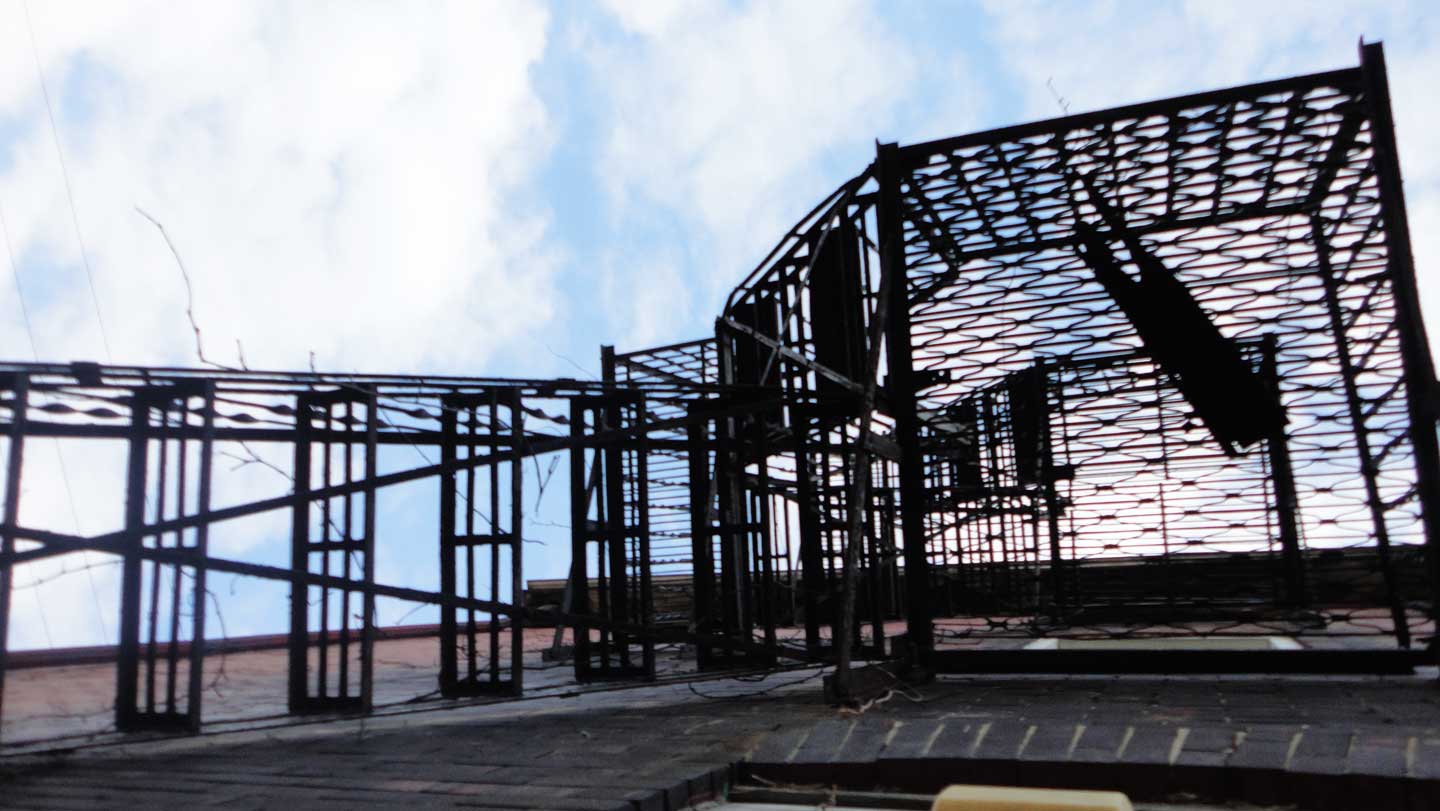 Below you can see the lowest landing of the fire escape… and definitely the worst part of it.  We are completely tearing it off and building an entirely new deck!  You can see here one of the guys cutting it away, piece by rusty piece.