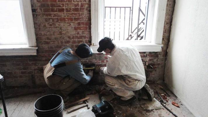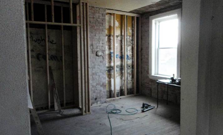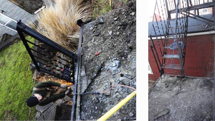 This week was mostly about the fire escape.  Years of neglect have left it barely clinging on to the building, with rickety railings and missing steps…  but we’re fixing that!  It was the biggest “con” on the list of “pros” and “cons” of buying the place, but luckily all of the “pros” won out.  See below for the steps we’re taking to bring this thing back up to “safe.”