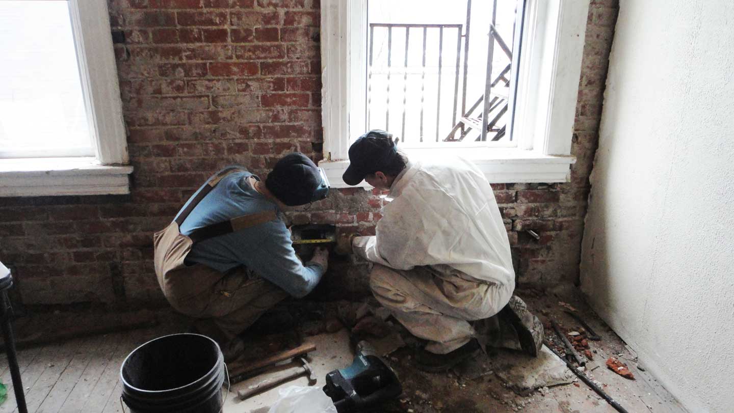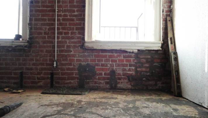 On each of the upper floors, we exposed all of the anchor points from the inside.  What we found was half-rusted anchors, which is kind of scary considering that we had been clambering up and down this thing over the past few months!