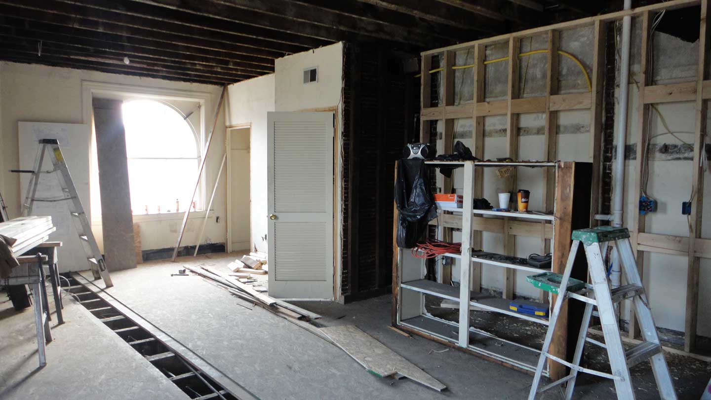 The Third Floor is also shaping up… the new kitchen’s wet wall is framed out, and plumbing roughed in.  Also roughed in is the lighting on the 2nd and 3rd Floors (the long trough in the floor is access to the ceiling of the loft below)