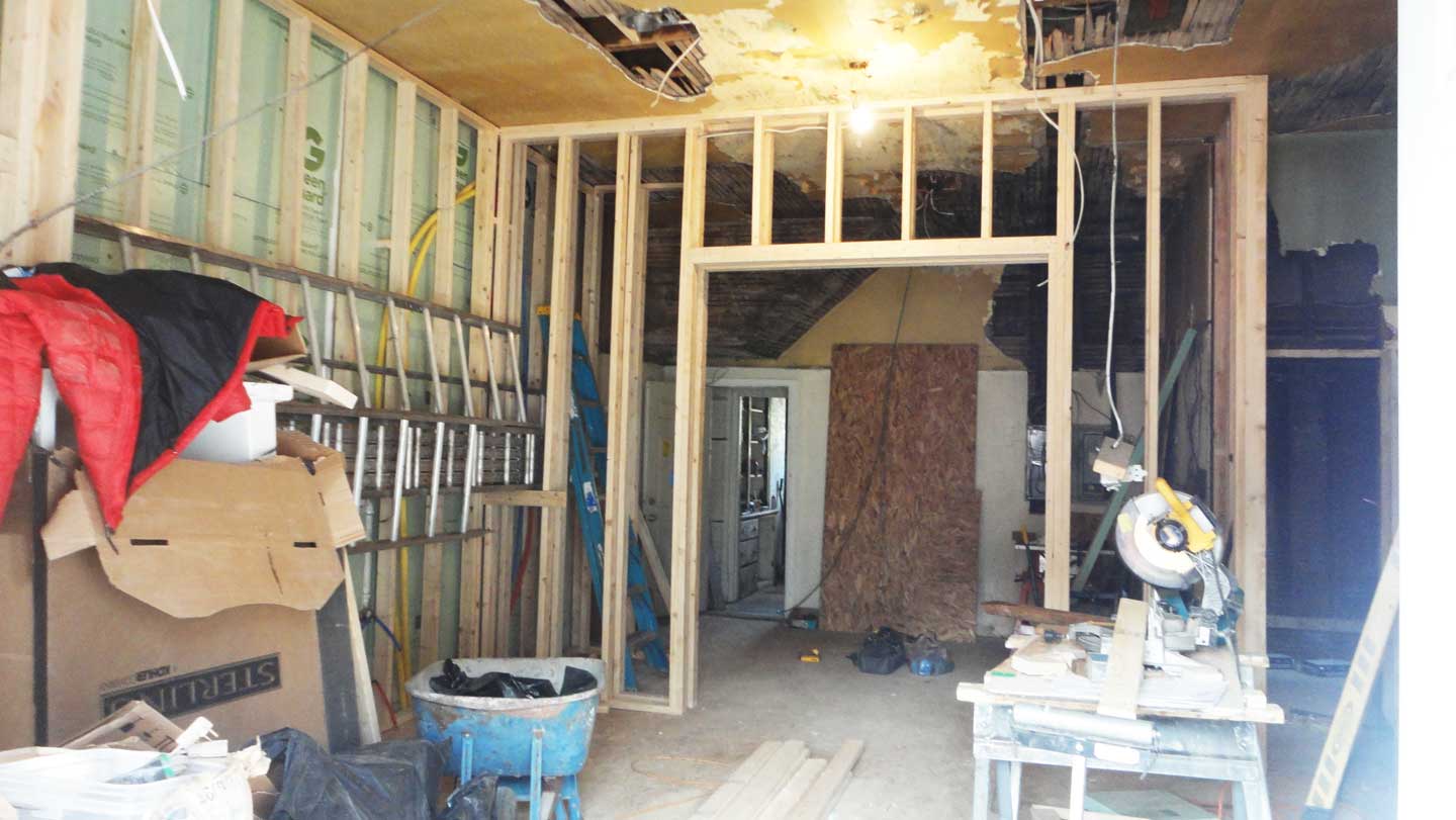And do you remember the results of the Social Media Design Review about whether or not to loft the bedroom in the First Floor Apartment? We decided not to, and instead to have a “normal” bedroom with a large set of pocket doors opening onto the living/kitchen area. This week the walls for that were framed in. This apartment is going to be so cool with its super-high ceilings!