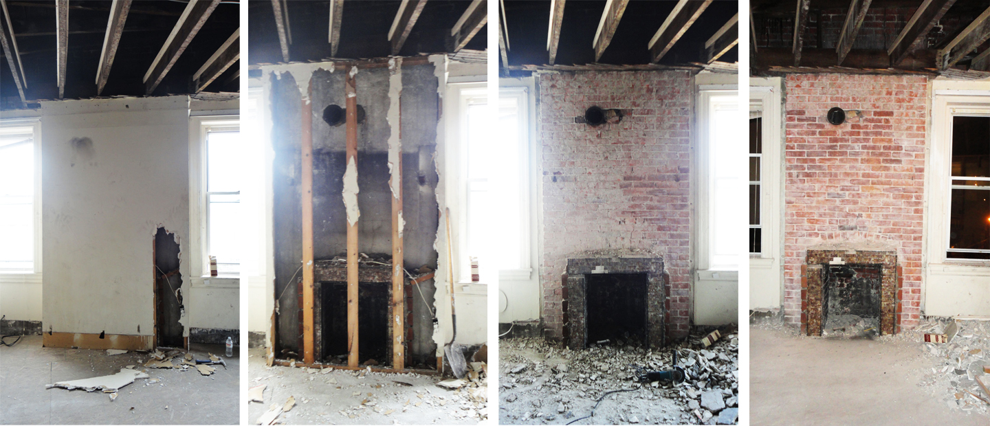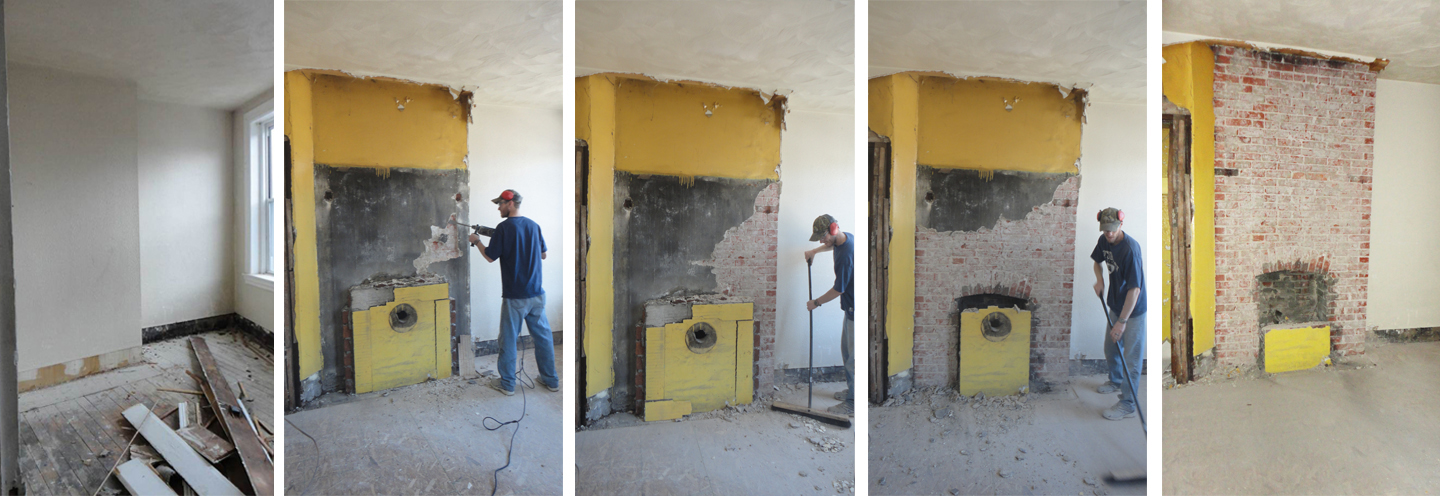 After having exposed some of the brick chimneys in the building, I was really itching to do a few more. They were begging for it really I swear. It wasn’t part of the contractor’s scope, but he agreed that if I did the work, he’d shovel all the debris out the window and haul it away for me. If you’ve ever demolished an old plaster wall, you know how huge that is. That stuff is heavy! My goal was to get one finished this weekend, and the other next weekend. With a little help, I got both mostly knocked out! Check out the progress: