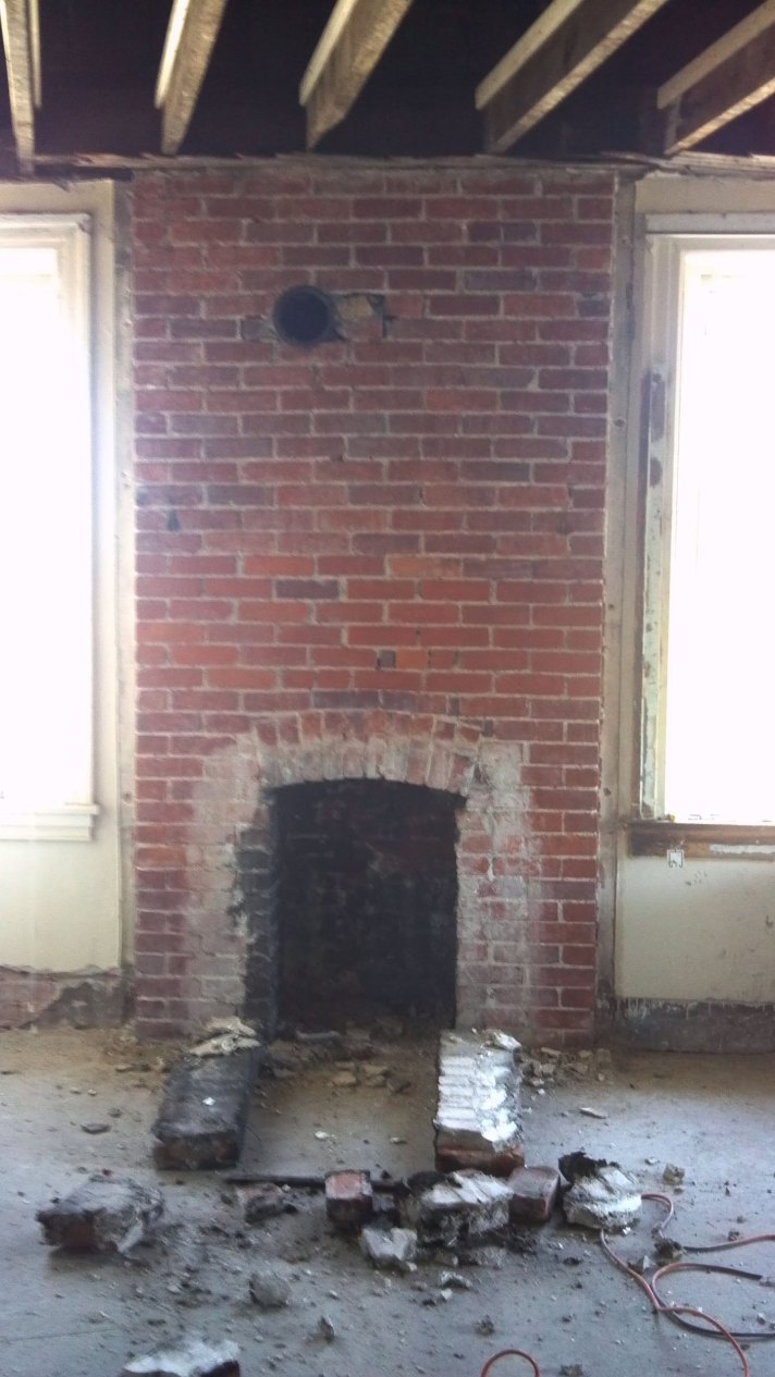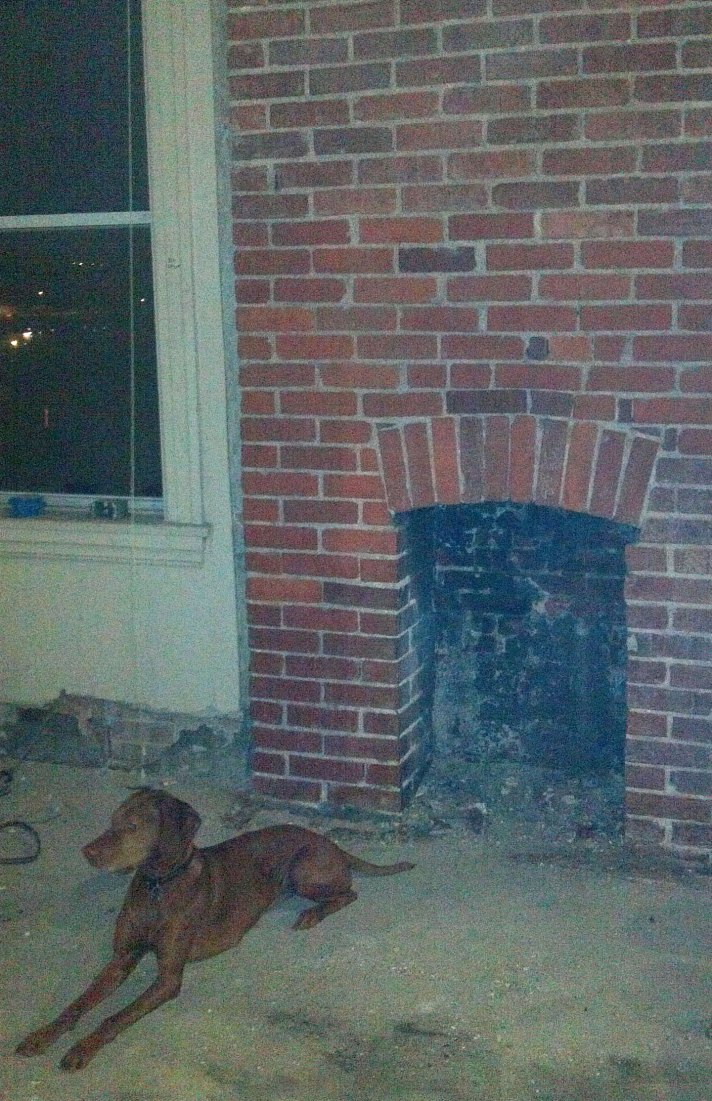 I also got myself into a grand adventure when I decided to expose 2 more chimneys. I actually had a lot of fun and am really happy with the result. In the following 2 pictures you can see a little more progress that wasn’t captured in the original post about these chimneys. The first photo is when I decided to ditch the tile surround. Don’t worry though, I knocked off all the tiles I could and kept them. We’re going to keep the surround in the bedroom, but the tiles here were an ugly mix of green, brown, and purple that I wasn’t crazy about. Once the surround came down I definitely didn’t miss it. I now have a total of 10 hours into one chimney and have about 2 more to go. Right now I am working on brushing the bricks by hand with water and a brass wire brush. You can see the line about half way up where I stopped. My dog, Ossie, also stopped by in the evening to give laying by the fireplace a trial run. She gives it a 10/10. Obviously.