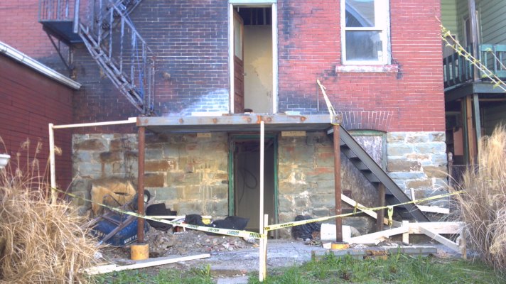 The guys also got busy continuing with the repair of the fire escape landing. They had the whole steel landing and steps rebuilt. We used some pieces of the existing landing, and some new pieces to get together a decent looking deck!