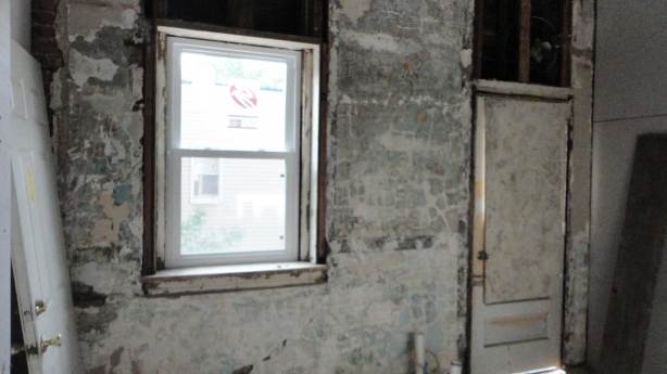 We then had this crazy idea… what if we just keep it?  Now that everything else in the apartment is drywalled up, it feels like it needs some sort of character and this could be perfect.  We could seal up the plaster and leave the wall more or less as it is.  While this is definitely an idea to which your parents would say “you’re doing what!?,” it seems that most people who have been interested in this apartment would be the type who would appreciate a move like this.