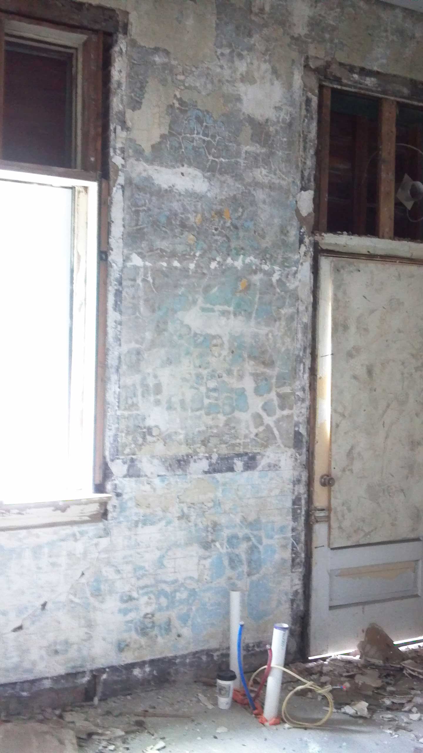 This week we also had a debate about keeping the plaster on the wall in the studio apartment. The final decision was… dun dun dun… it’s got to go. While it’s beautiful, it’s not practical a) for a kitchen (especially right over the worksurface) and b) for a rental unit (hello lead paint poisoning lawsuit). If this were my house, and maybe any room but the kitchen, I’d totally have kept it. We decided that with my newly acquired brick exposing skills, the wall would look great with exposed brick, and safely give the room the character it’s missing now. Actually this wall is exposed the entire way up in the other apartments, so it makes sense to do it here too. I promise I will be crying on the inside the whole time I’m jackhammering away on this thing though. As some of you suggested, I’m going to try and preserve it (although I admit it’s highly unlikely I’ll have any success) to show off somewhere in the future. Like maybe framed in my living room, where it may be relatively more appropriate.