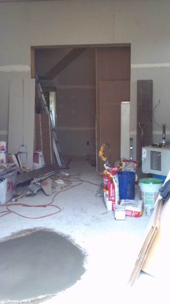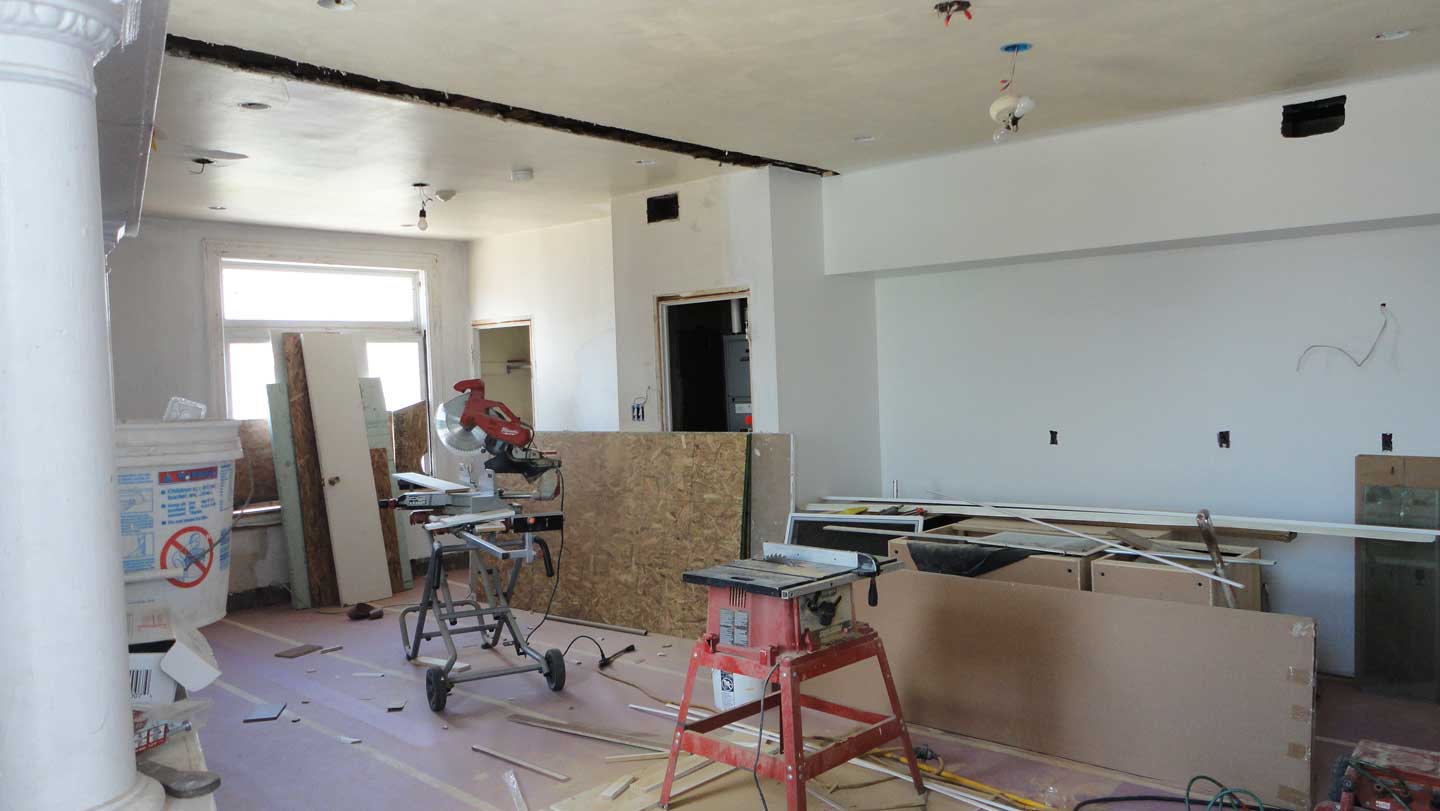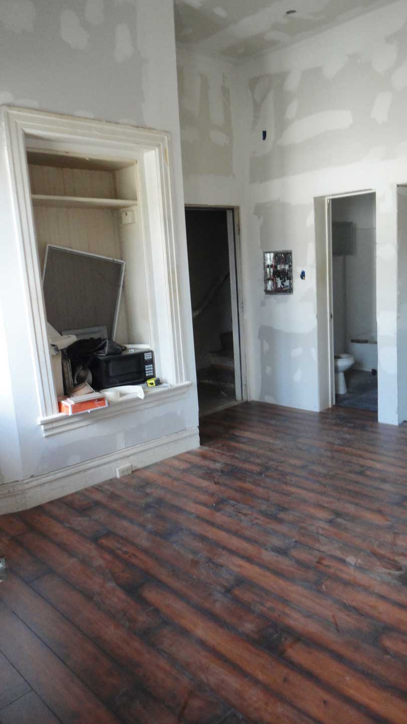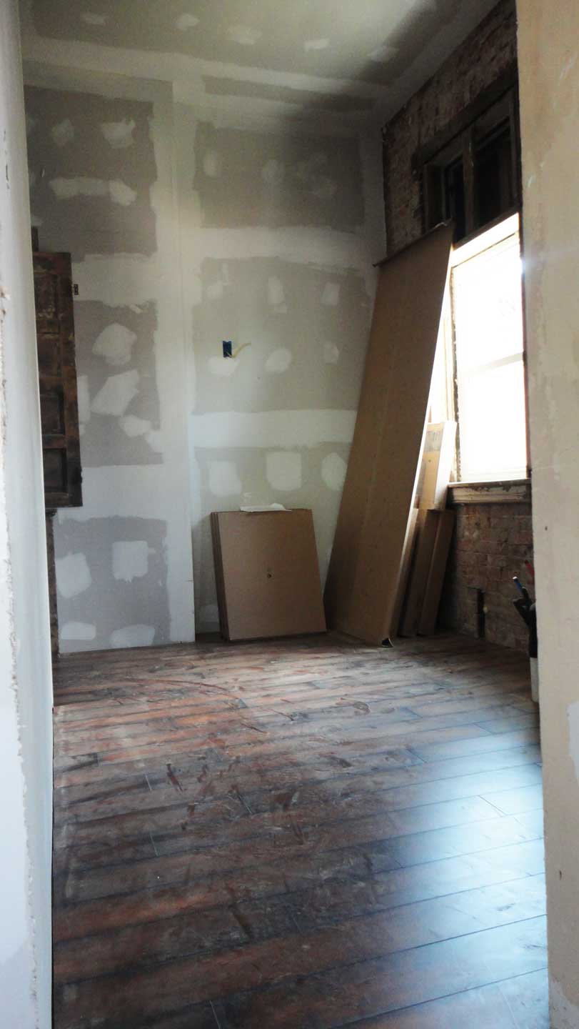 And here’s a shot of the 2nd floor’s lving/ kitchen.  If it looks familiar, this apartment has a layout almost identical to the one upstairs that’s already got the kitchen cabinets installed.  Here the drywall is all finished, awaiting cabinet installation.  As you can see, the flooring is already covered up… safe and sound!