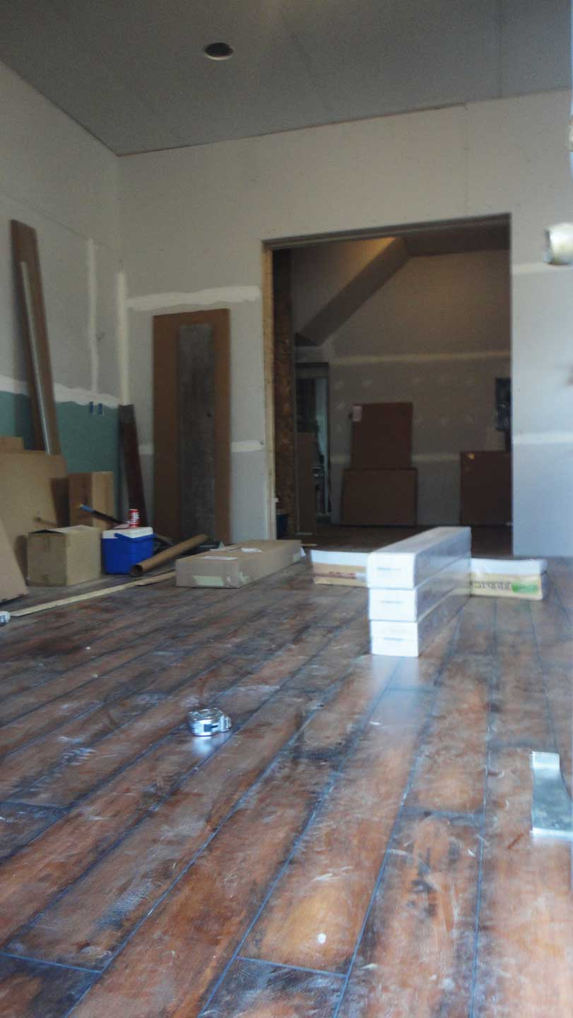 This building is over 100 years old, and so we’re dealing with a lot of un-straight and un-square things.  It’s not perfect, but luckily it’s pretty solid and things haven’t warped too badly.  We put down 3/4″ OSB underlayment over the existing floorboards to help level things out a bit, and that worked in most places except for a few.  Here you can see where there was a dip in the floor, topping out at a whole 5/8″… which is a lot.  So that puddle you see is some leveling compound… so there’s no more dip and the floor will lay flat.