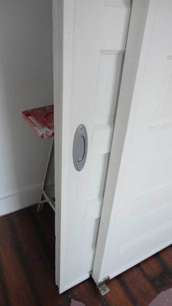 Here’s a close-up of those installed doors and the detailing on them.  They sure don’t make ’em like that anymore!  The hardware is also original to those doors.  Although it’s totally not my style, I’m trying to stick to my rule of thumb, being that all original stuff stays if it can be helped at all.