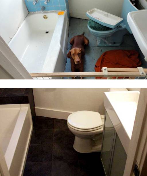 another view of the bathroom (and Ossie giving me the stink-eye for leaving her locked up in it):