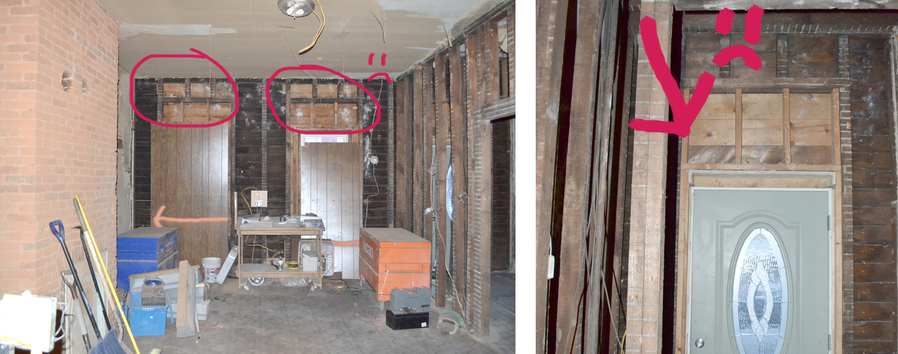 I wasn’t planning on tearing out all the original plaster, but with the haywire electrical and other oddities going on in here, we decided to go the whole 9 yards and gut this thing pretty much to the studs…. thus revealing a ton of TRANSOM windows.  That’s kind of heartbreaking because I would have loved to open those up again.  Sadly, opening the transoms would be going backwards and I just can’t afford that.  The previous owner installed brand new windows  and brick veneer only a few years ago.  It’s definitely not what I would have done, but I also just don’t have the money to backtrack.  Boo.