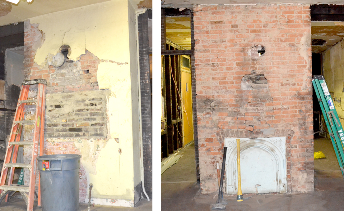 If you read the last post, you saw the general layout for these apartments… which is a bedroom at one end with a large open kitchen/living space that is divided by the chimney at the other end.  In general, the chimneys in the house are all fine… except the one in the 1st floor unit… which is really in terrible condition.  Like, really bad.  If I had unlimited dollars I would rebuild the chimney.  Buuuut I have to draw the line somewhere.  We’re going to fix it so it is at least not falling down, but it’s not going to be pretty.  So, no exposed brick in the living/kitchen downstairs.  I’m thinking tile instead?