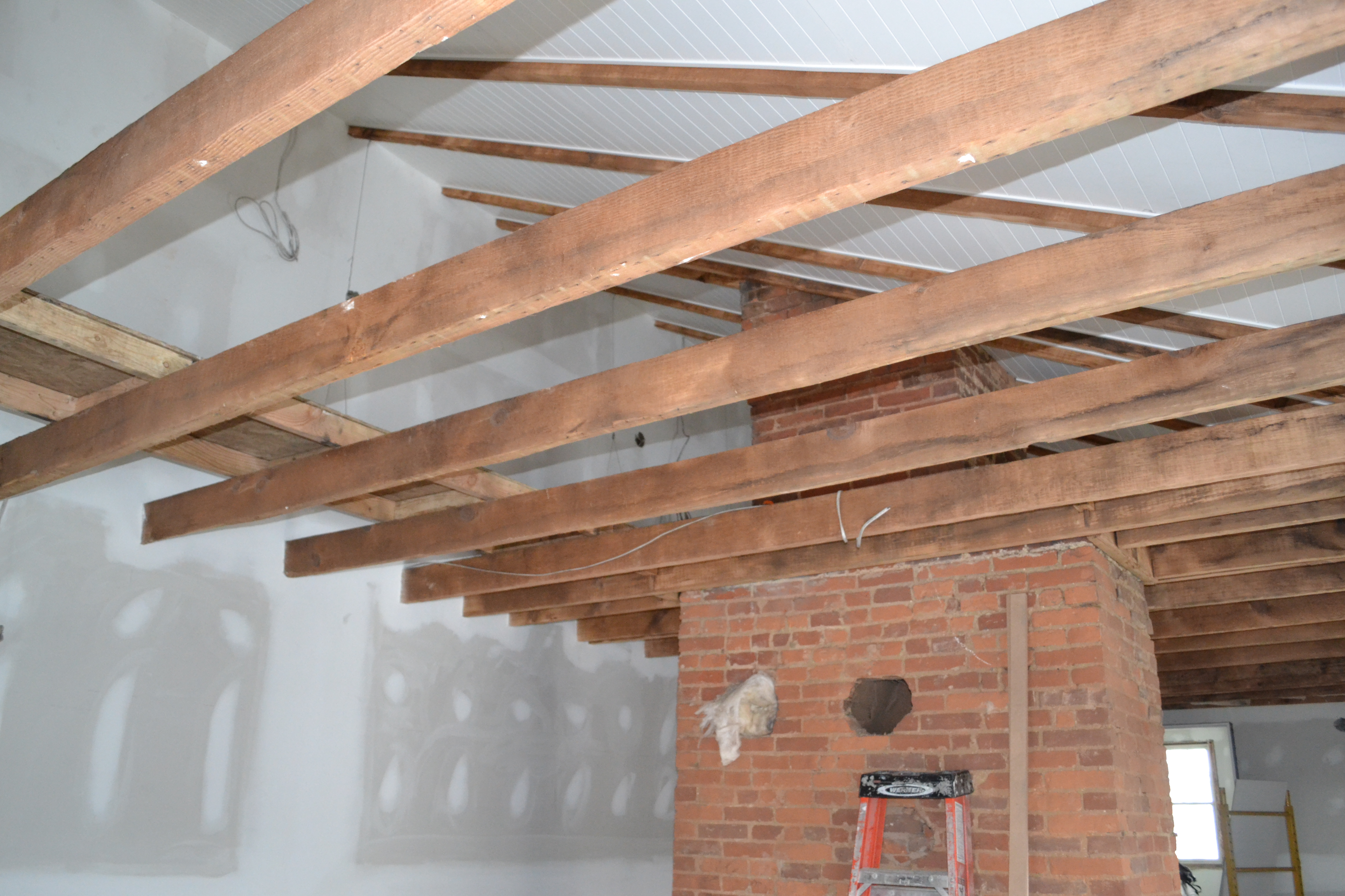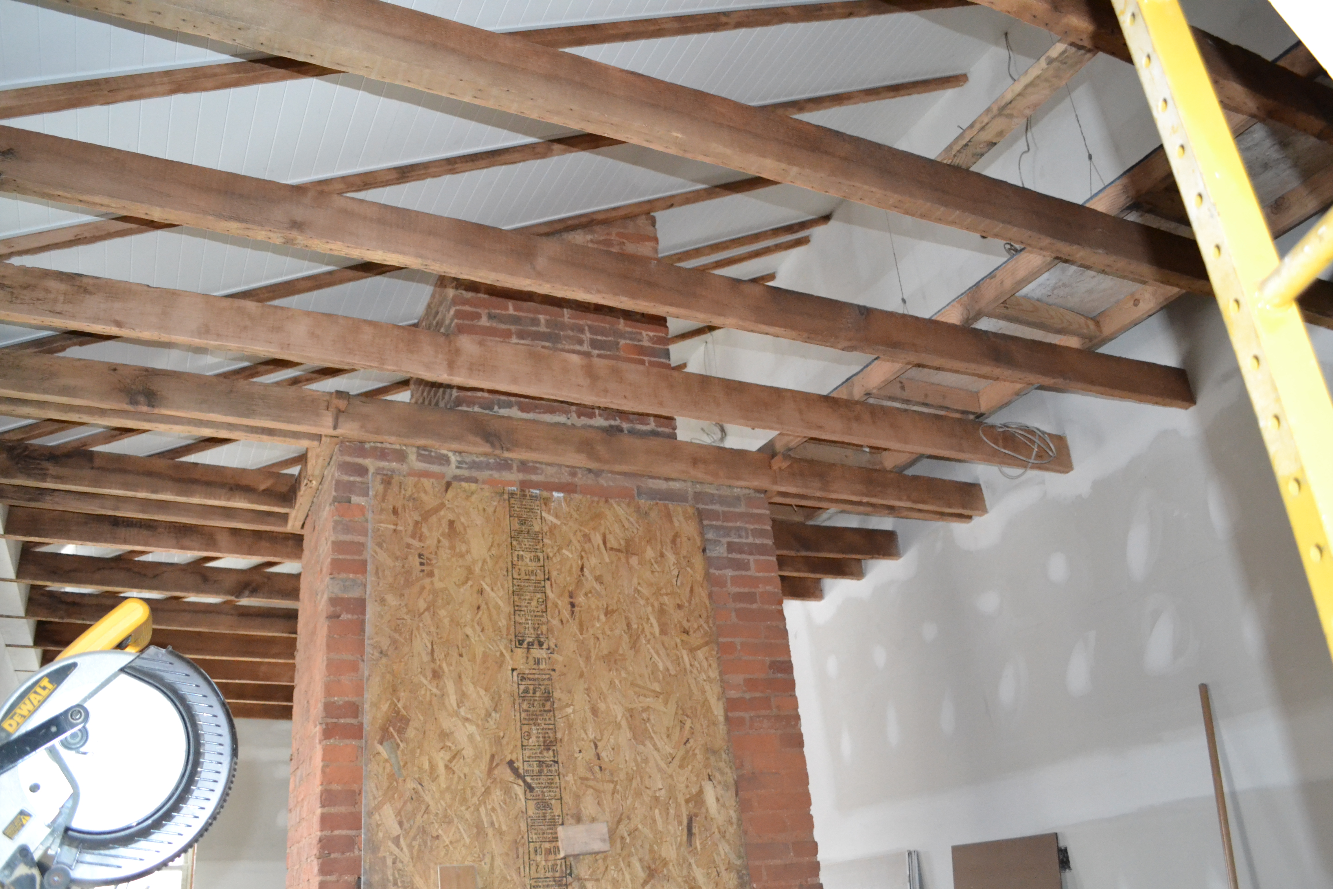 Below is the detailing at the low edge of the roof. The way the rafers tied in to each other was really a jumbled mess so the guys figured out a slick fix. These are MDF boxes made to look like a beam. It’s not what I would have designed if we were starting from scratch, but part of the beauty of these projects is how you work with what you’ve got. And we’re workin it over here!