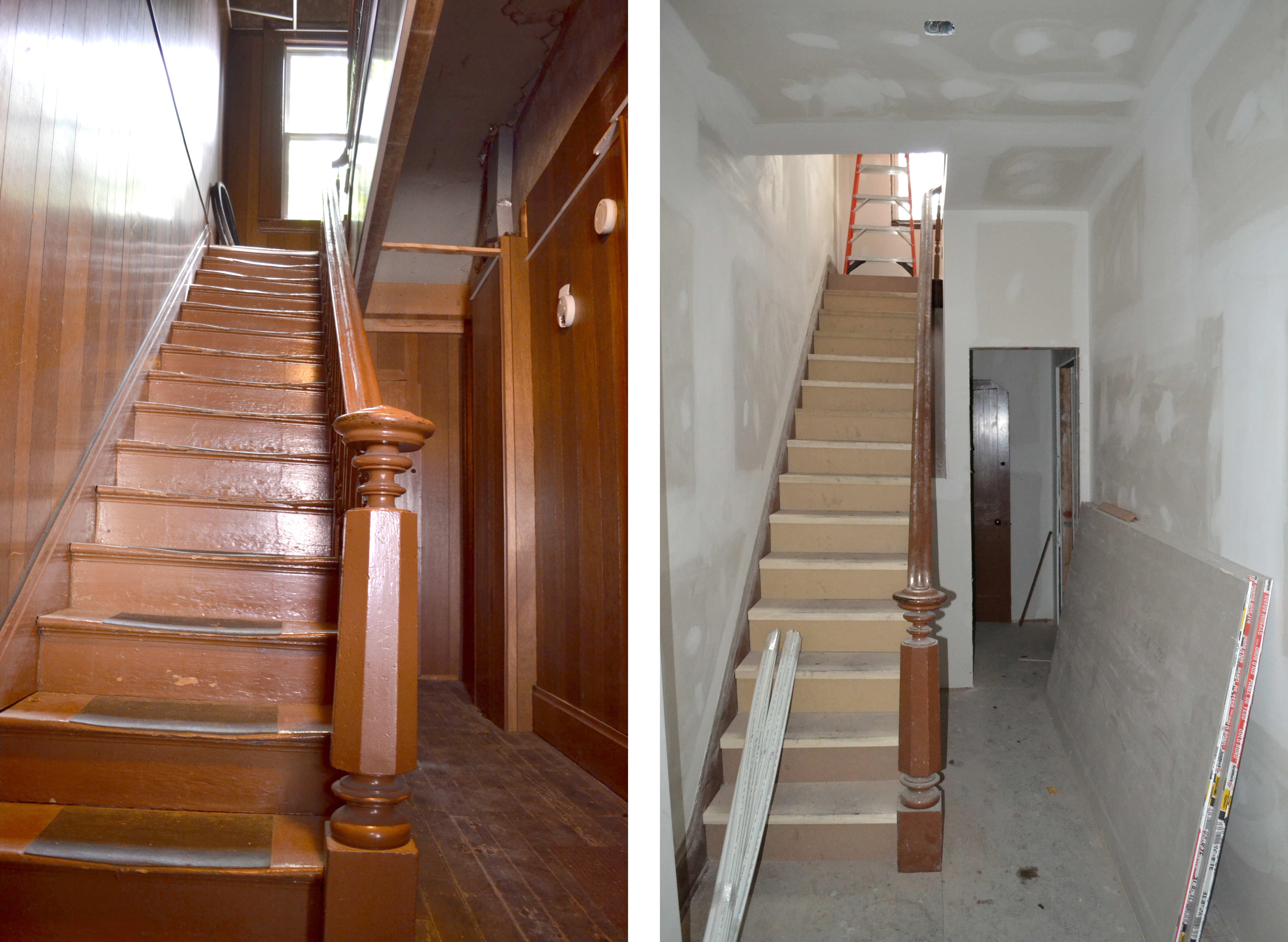 And finally… speaking of working with what you’re given… The stair was the only original part of the house that was really left, and the only part I was particularly endeared to. Years of people trodding up and down them had left the treads in really bad shape (check out the picture at left). Not to mention the fact that they were super crooked due to the house settling. We jacked up the house from the basement to level things out as much as possible. Truly fixing the stair would have meant taking the entire thing apart and rebuilding. I couldn’t afford that, so as a mid-ground fix, we made cap pieces to go over the existing treads… making it look brand new-ish. Check out the then-and-now below.