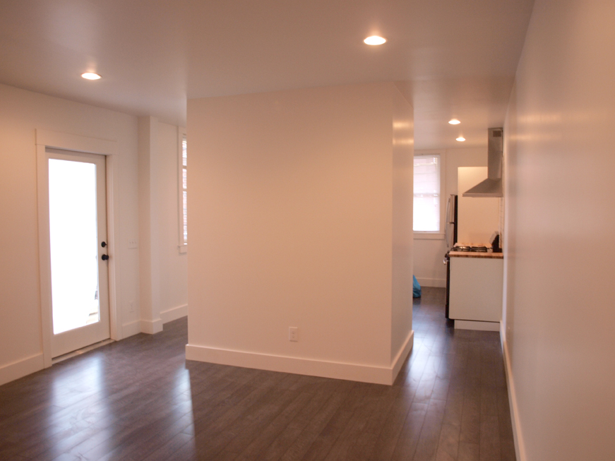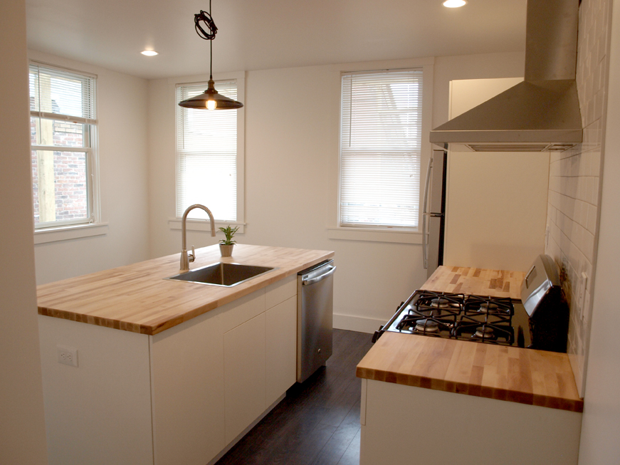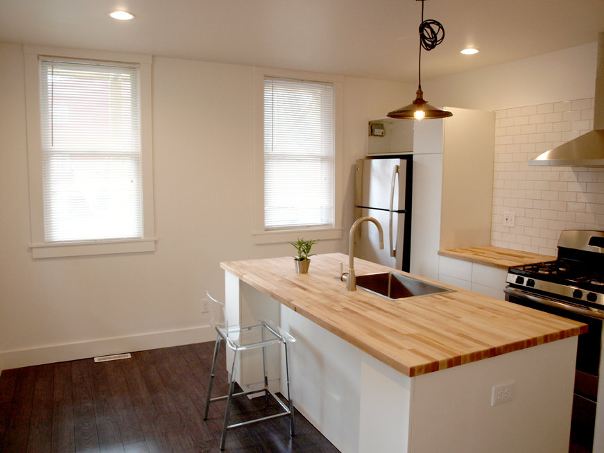 Hopefully I can get in there and get some final (albeit furnished) pictures soon. Until then, here are some 98% done pictures of the kitchen and living room. I had to take the pictures with the bedroom doors closed to hide all of the tenant’s furniture and boxes waiting to be unpacked. That’s pretty unfortunate because we did all that work to open the two rooms to each other. Haha. So these final shots are not perfect, but here they are! See if you can spot the missing light fixtures, cabinet doors, etc. It’s like a scavenger hunt!